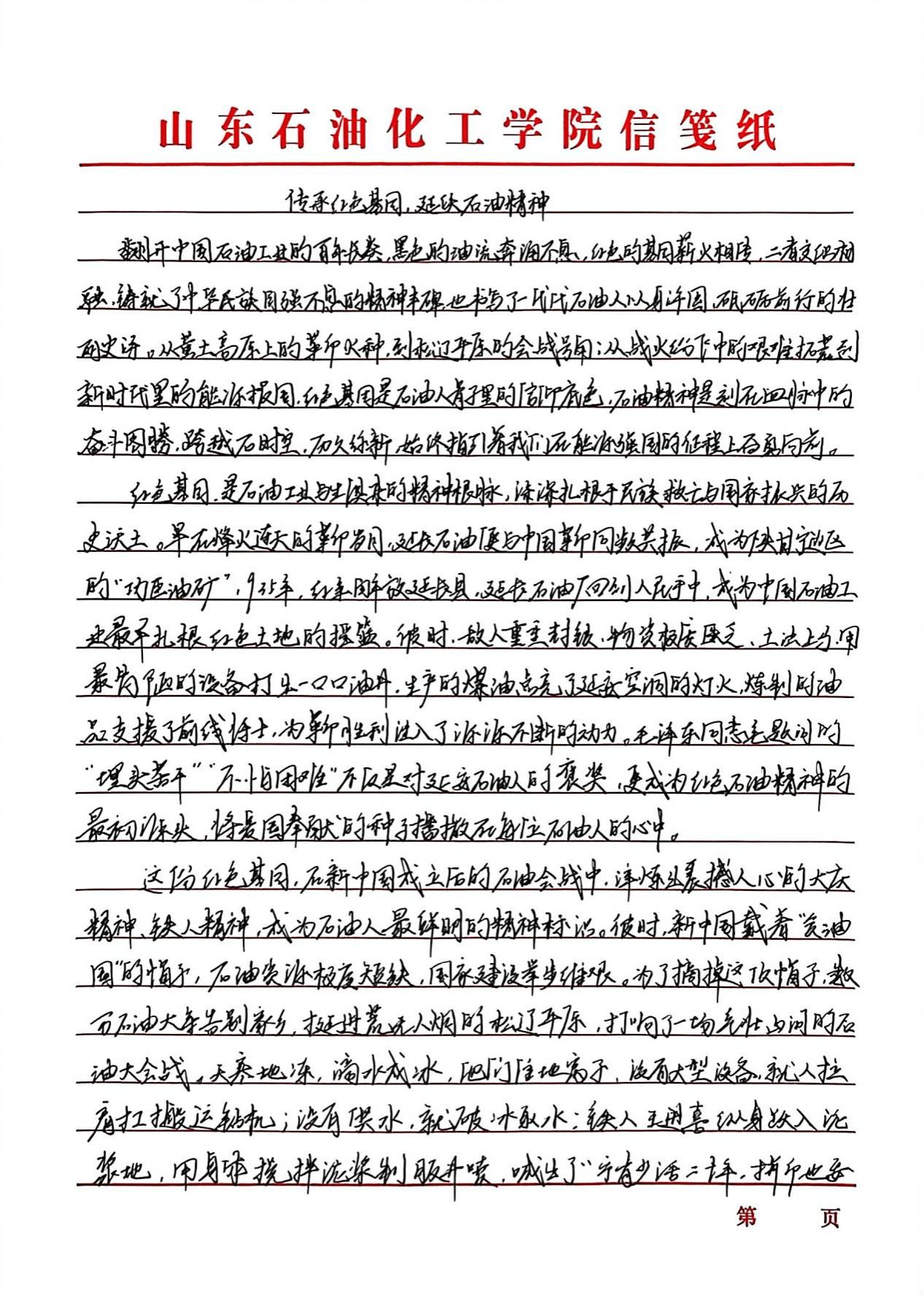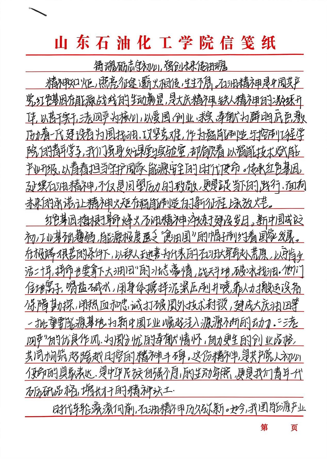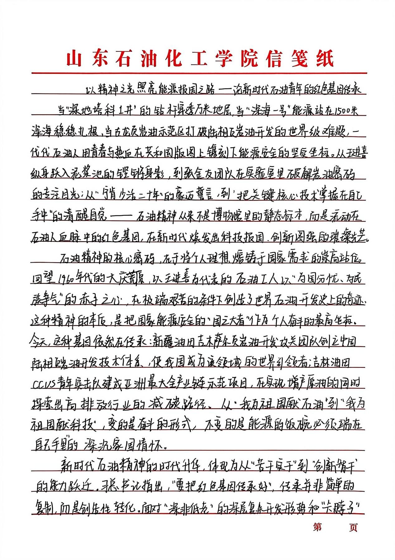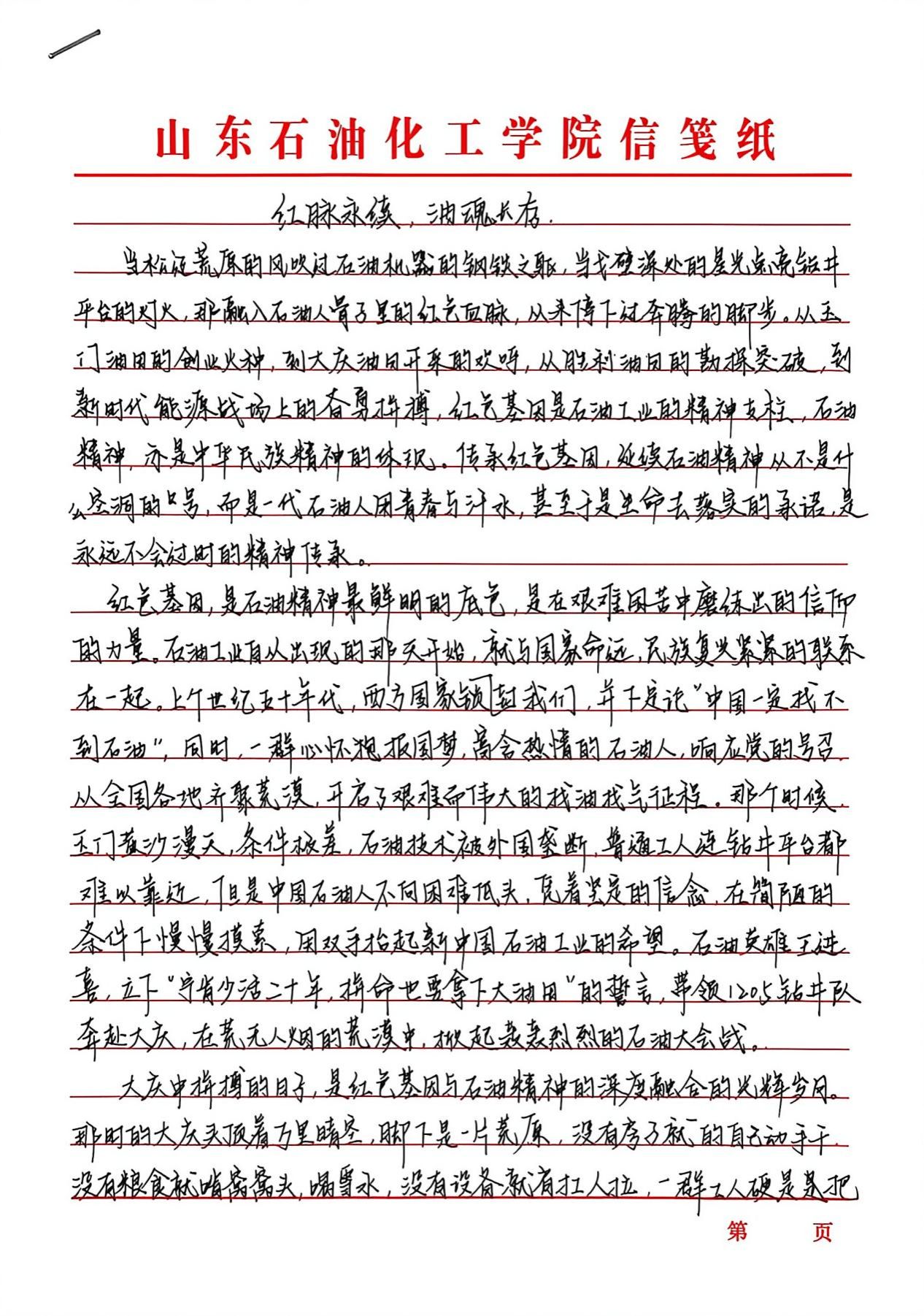 “传承红色基因,延续石油精神”征文活动以激扬文字镌刻时代担当,在跃动的笔尖与深沉的思考间,青年学子实现了从历史回望到精神传承的跨越。创作者们以墨为媒搭建与石油英模对话的桥梁,将铁人精神中的艰苦奋斗淬炼成富有青春力量的实践篇章。既是莘莘学子家国情怀与使命意识的智慧激荡,更通过青年视角的感悟书写,让石油精神在校园沃土中萌发新芽。这场思想盛宴不仅见证着青年与时代脉搏的同频共振,更为能源报国事业注入了蓬勃的青春动能。