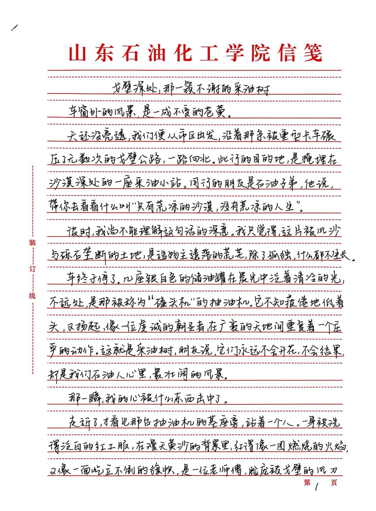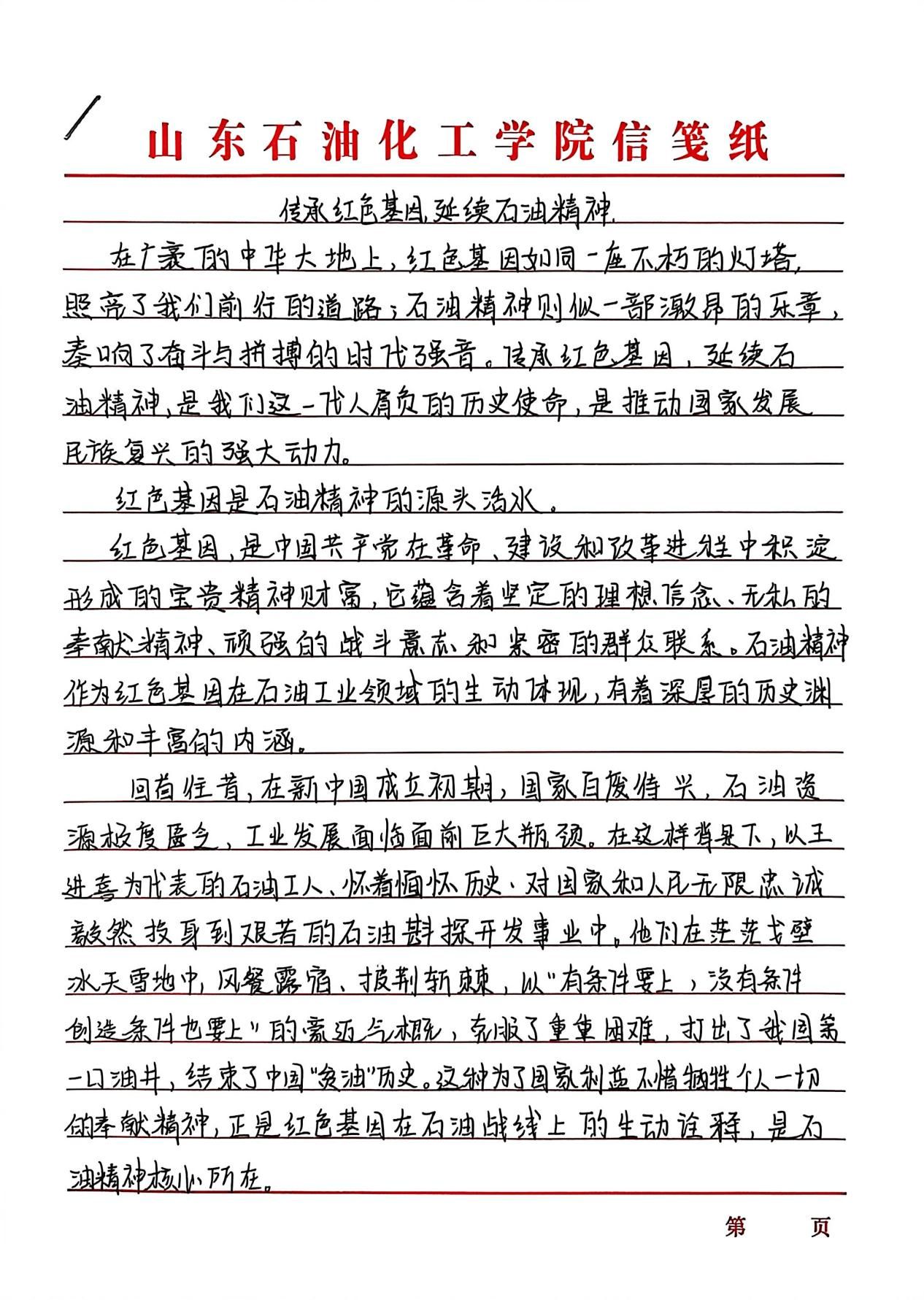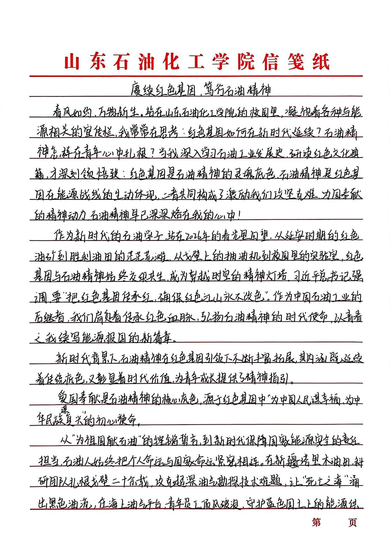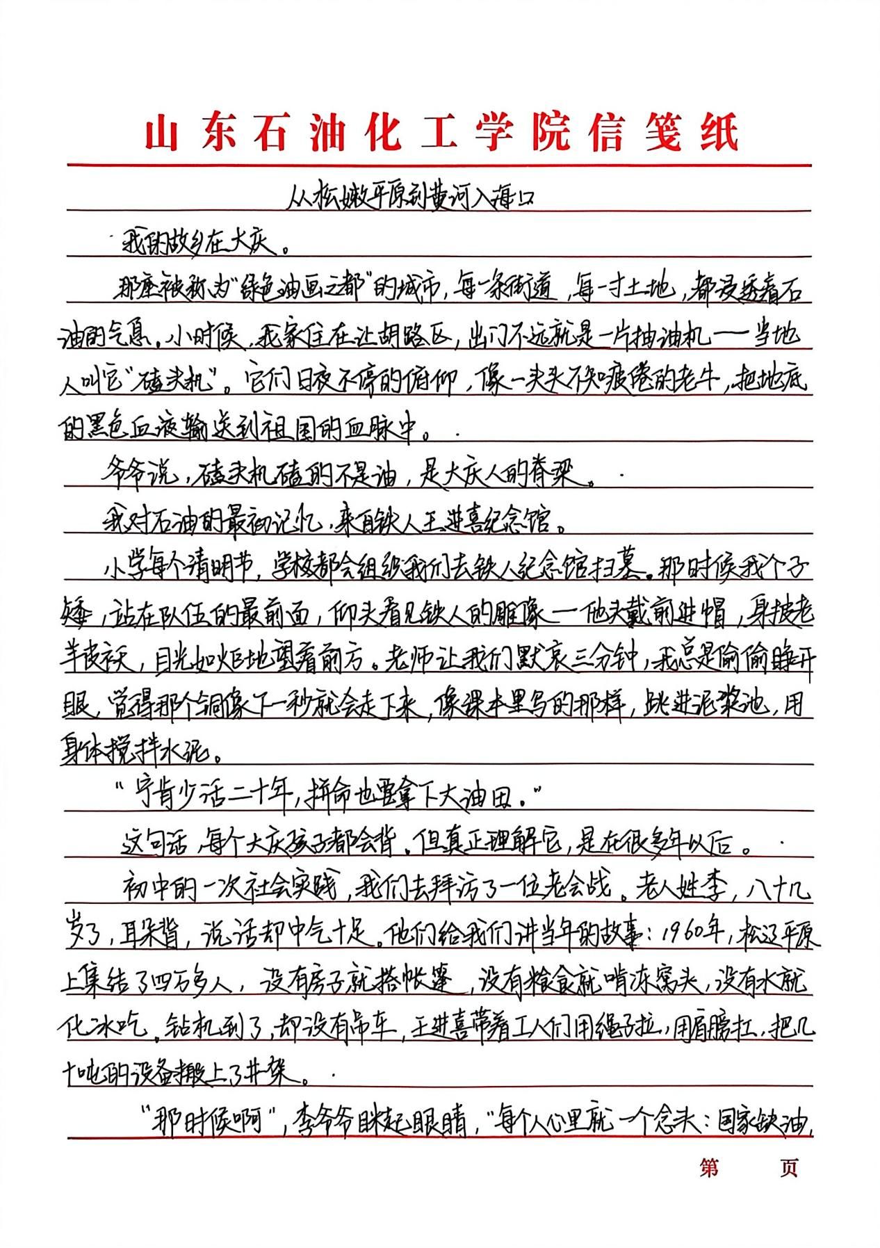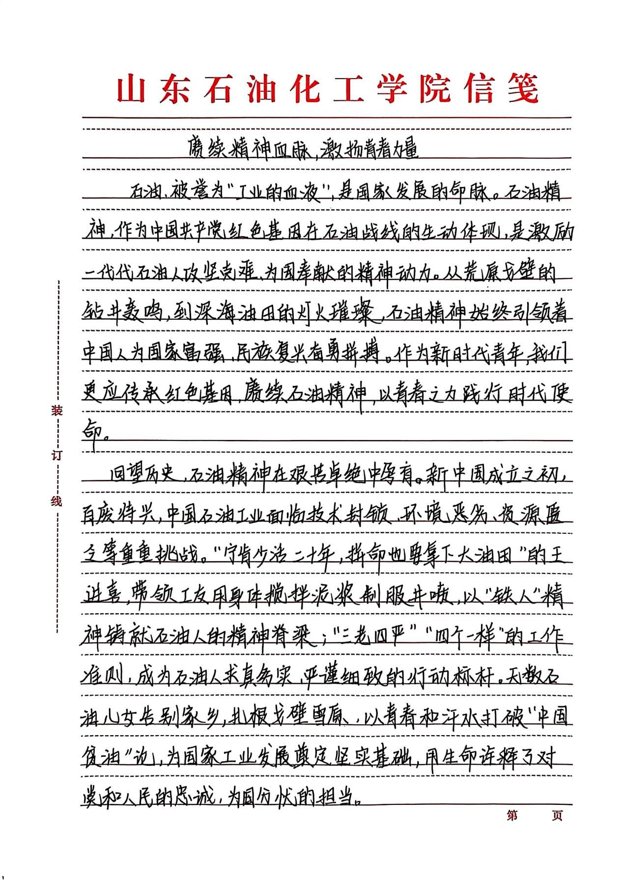 “传承红色基因,延续石油精神”征文活动以激扬文字镌刻时代担当,在跃动的笔尖与深沉的思考间,青年学子实现了从历史回望到精神传承的跨越。创作者们以墨为媒搭建与石油英模对话的桥梁,将铁人精神中的艰苦奋斗淬炼成富有青春力量的实践篇章。既是莘莘学子家国情怀与使命意识的智慧激荡,更通过青年视角的感悟书写,让石油精神在校园沃土中萌发新芽。这场思想盛宴不仅见证着青年与时代脉搏的同频共振,更为能源报国事业注入了蓬勃的青春动能。