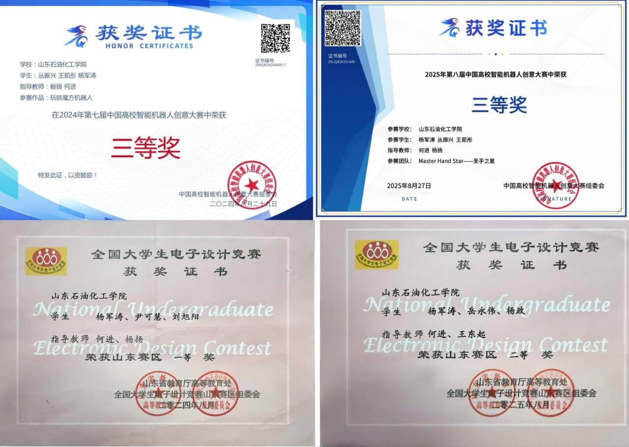 在学科竞赛中,他屡获殊荣,包括TI杯全国大学生电子设计竞赛山东赛区一等奖、第七届和第八届中国高校智能机器人创意大赛国家级三等奖、“高教杯”全国大学生先进成图技术与产品信息建模创新大赛国家级二等奖和三等奖等多项国家级、省级重要奖项。在备战竞赛过程中,他展现出卓越的团队协作精神、项目统筹能力和攻坚克难的毅力。