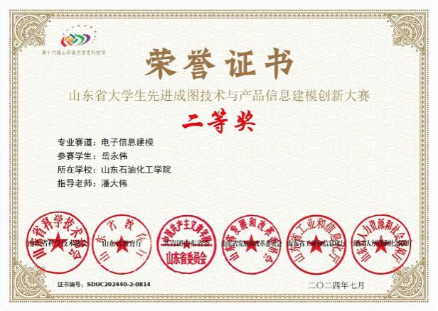 2024年7月 获山东省山东省大学生先进成图技术与产品信息建模创新大赛(电子信息建模个人)二等奖;