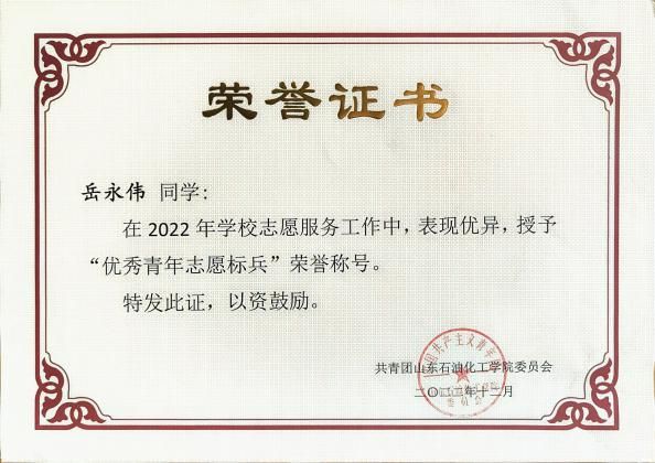 岳永伟秉持全面发展理念,深耕专业的同时注重多元提升:热爱体育运动,积极参与团队活动,锤炼了强健体魄与协作能力;已取得大学英语四级、WPS Office二级证书,普通话达二级乙等,为专业学习与实践提供有力支撑。凭借综合表现,多次获评 “优秀学生”“优秀志愿者”,以昂扬姿态展现青年风采。。