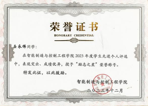 荣誉称号:学校“优秀青年志愿标兵”“励志之星”“优秀志愿者”、“优秀学生”等荣誉称号;